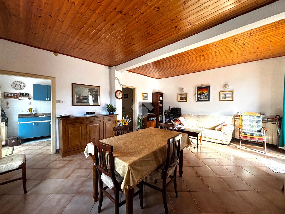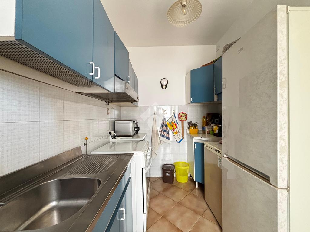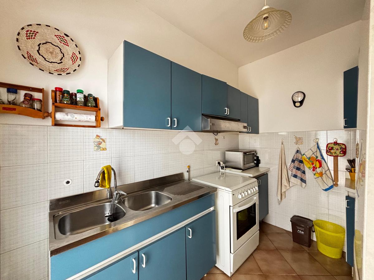 Si entra nell'ampio soggiorno, separato dal cucinotto finestrato, e vi sono anche un ripostiglio e un bagno di servizio finestrato.