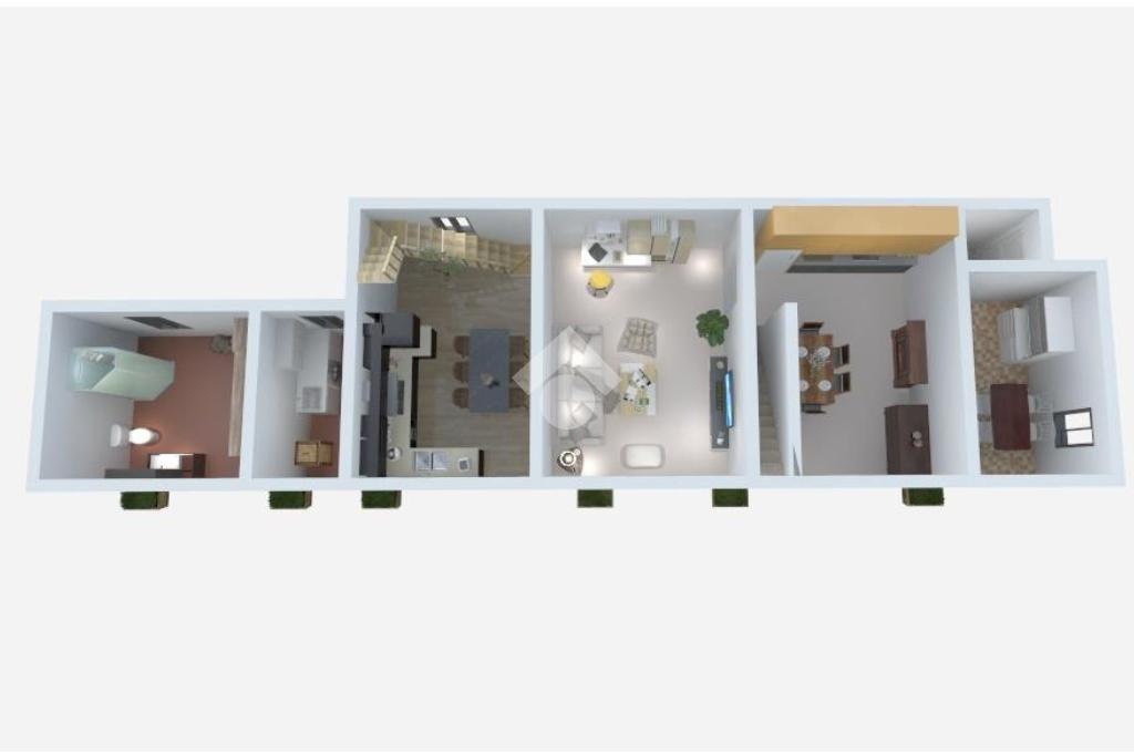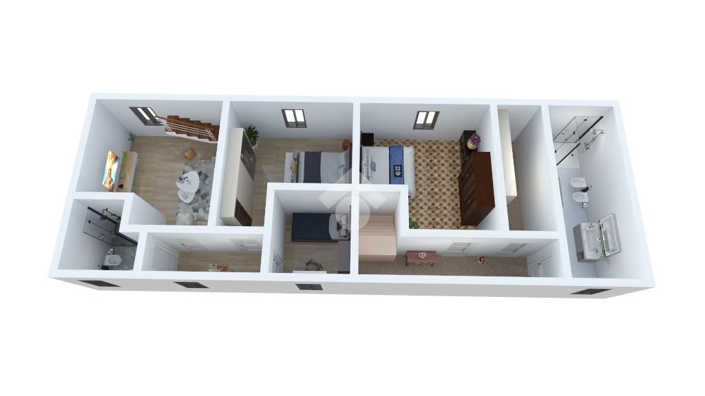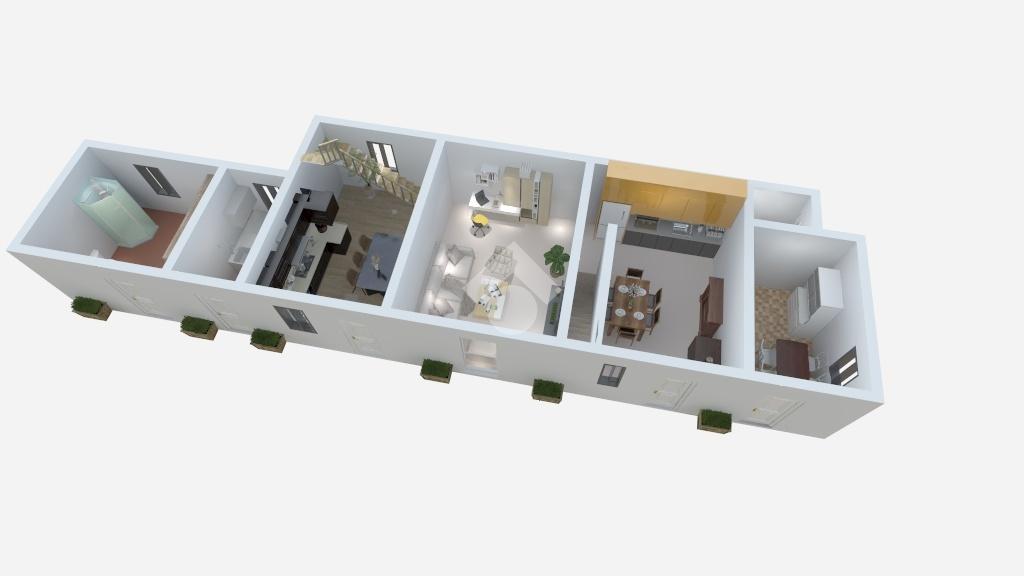Il primo Terratetto è così sviluppato: si entra nella cucina abitabile al piano terra, salendo le scale si raggiunge il soggiorno, il bagno finestrato con doccia, l'ampia camera da letto matrimoniale e uno studio.