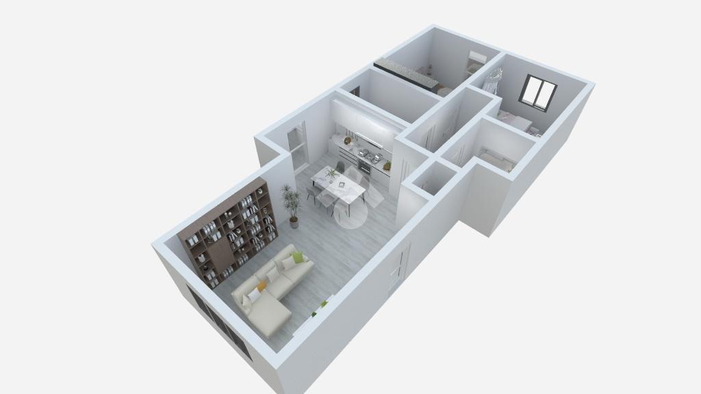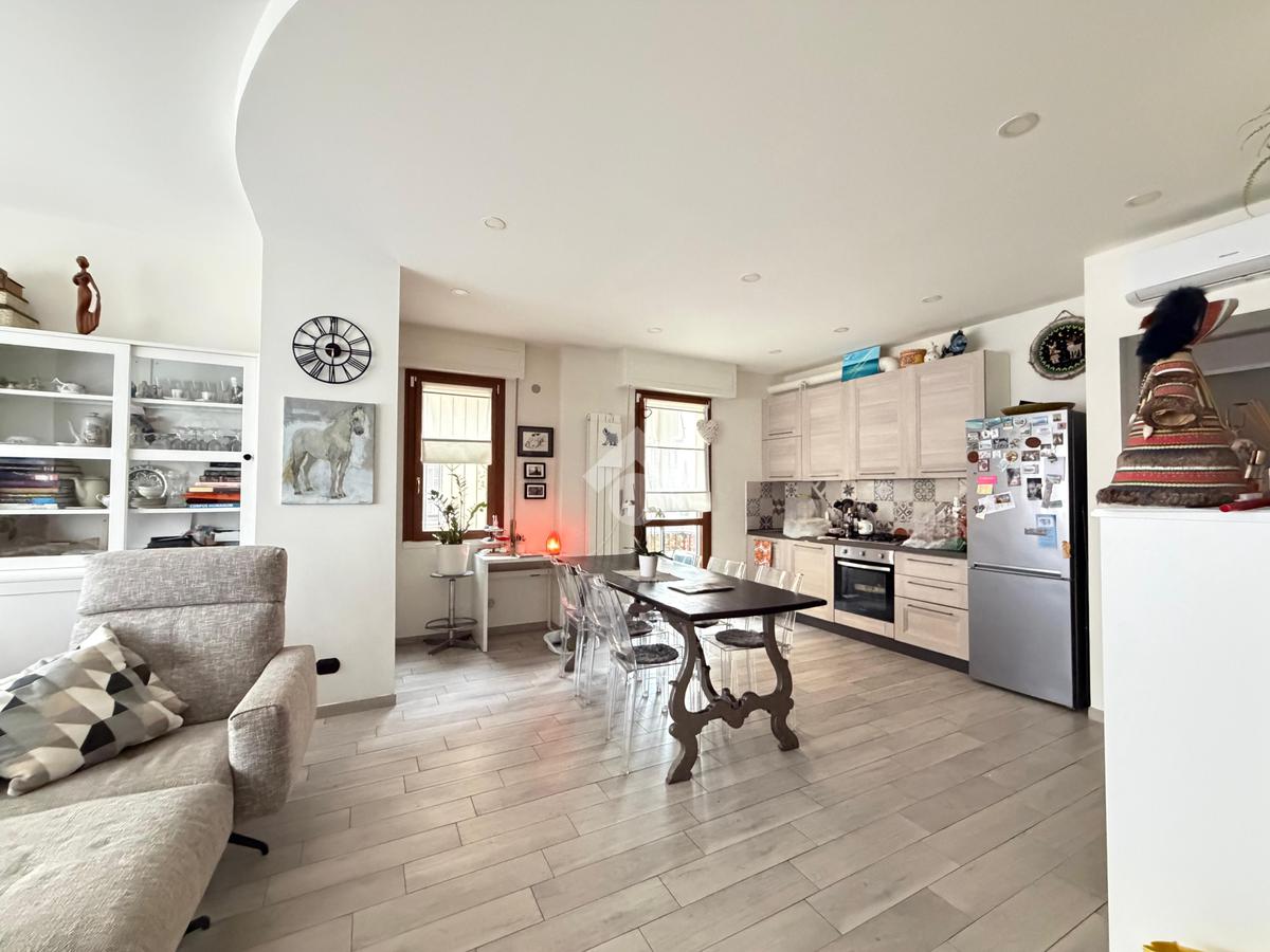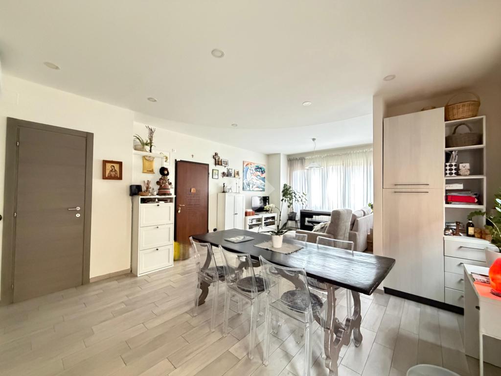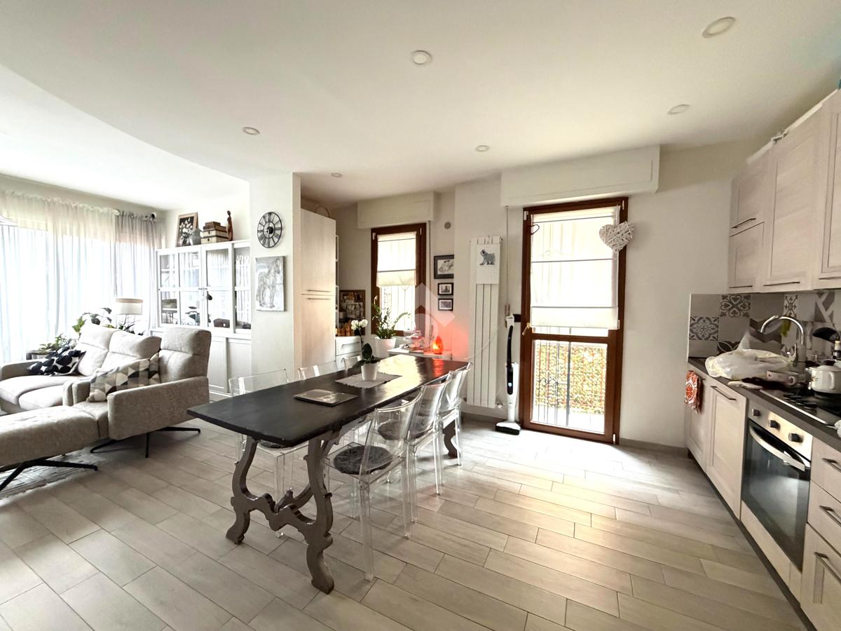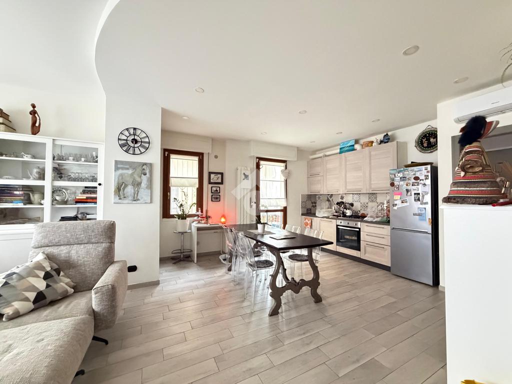 Si entra nell'ampia zona giorno con angolo cottura, dotata anche di ripostiglio e accesso al balcone.