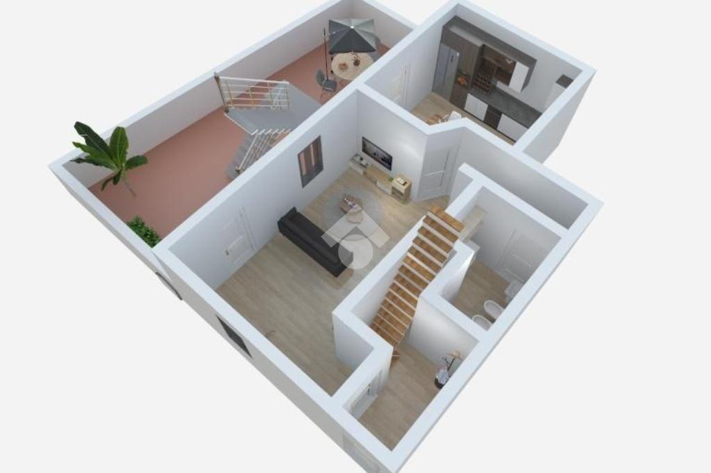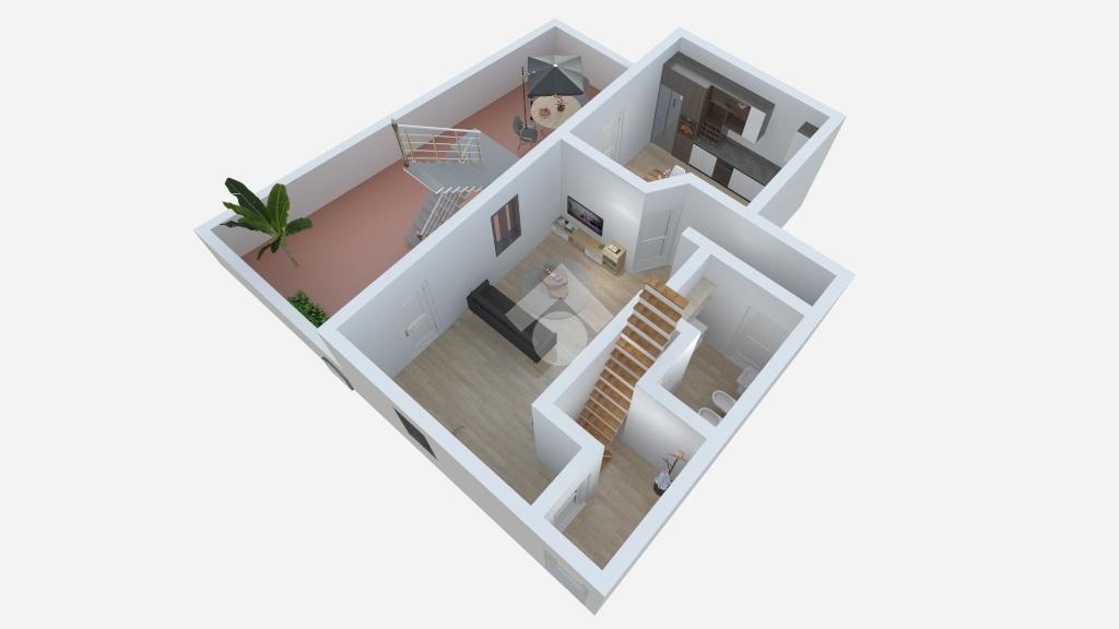 Dall'ingresso si passa allo spazioso soggiorno, separato dalla cucina abitabile. Sullo stesso piano vi è anche un bagno con doccia.